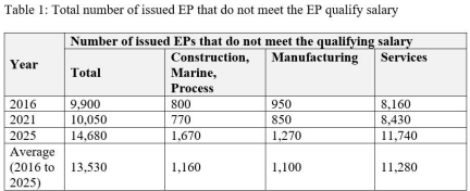 Dr Tan See Leng: Over 2016 to 2025, the Employment Pass (EP) qualifying salary has increased from $3,300 to $5,600, while the number of EPs has increased from 192,300 to 202,100. Table 1 provides the number of EPs issued that did not meet the EP qualifying salary over this period.