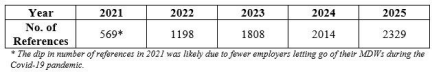 From 2021 to 2025, the number of instances in which past employers of MDWs offered to act as referees for their ex-workers is as shown in the table. The figures account for less than 2% of MDWs whose work permits expire or are cancelled each year. As MOM has no access to feedback shared by past employers of MDWs, we do not verify the feedback or attach them to an MDW’s employment record.