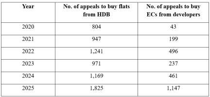 Mr Chee Hong Tat: From 2020 to 2025, the number of appeals to waive the income ceiling to buy flats from the Housing and Development Board (HDB) or Executive Condominium (EC) units from property developers were: