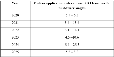 Mr Chee Hong Tat: The median application rates of first timer singles applying for 2-room Flexi flats in Build-To-Order (BTO) exercises conducted from 2020 to 2025 are indicated below.