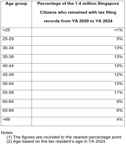 There were about 1.6 million Singapore Citizens with tax filing records in the Year of Assessment (YA) 2020. Of these, about 1.4 million had tax filing records in YA 2024. Those who dropped out could have done so due to a variety of reasons, such as death, retirement, unemployment, or relocation overseas. Of the 1.4 million, about 55% were male and 45% were female. The breakdown by age group is as follows: